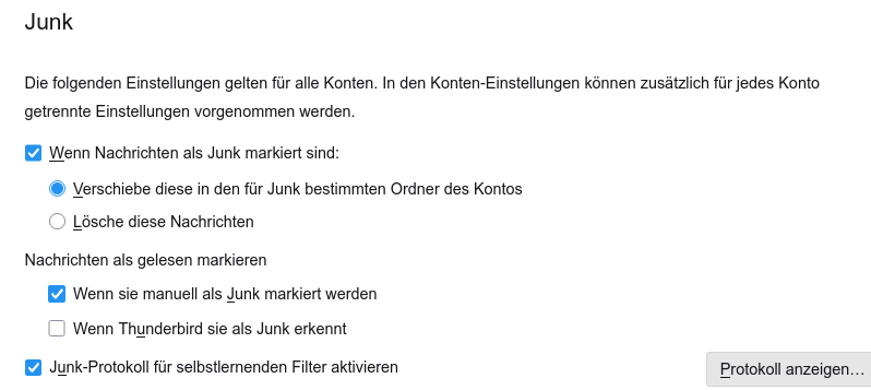 Entsprechend der Einstellungen sollte erkannte Junk Mail aus dem Junk Ordner nach einem Tag gelöscht werden (wie es auch in der Thunderbird-Anleitung beschrieben ist und wie es in der Vergangenheit auch war). Aber die Junk Mail wird seit einem der letzten Updates (z.Zt. 138.0.2) nur in den Papierkorb verschoben, statt daß sie gelöscht wird ... - was aus meiner Sicht keinen Sinn macht. Wie kann man diesen Makel beheben? Danke im voraus für jeden Hinweis.