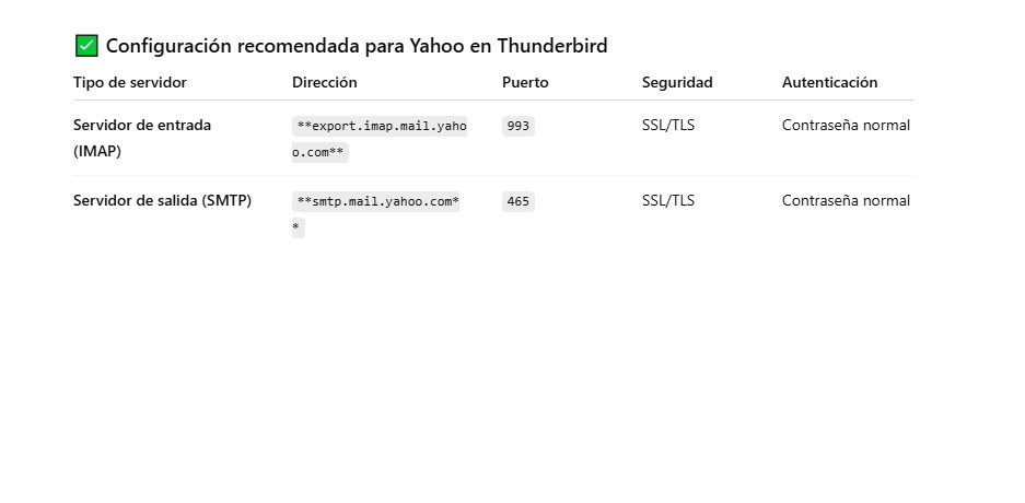 El truco es cambiar el servidor de entrada por defecto de yahoo que es imap.mail.yahoo.com por este export.imap.mail.yahoo.com y el puerto siempre será el mismo 993 y con el puerto de salida smtp.mail.yahoo.com ese no cambia se mantiene y su puerto 465