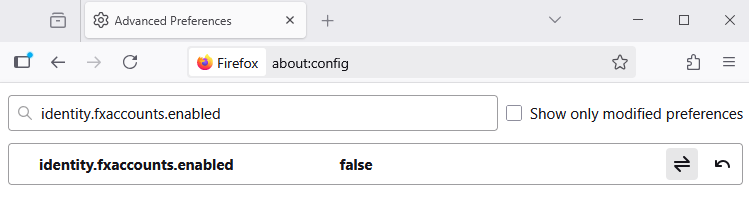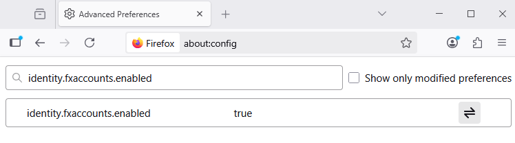 1 - Go to Configuration Editor for Firefox https://support.mozilla.org/en-US/kb/about-config-editor-firefox 2 - Enter a search term identity.fxaccounts.enabled (value by defaut true) If value not true, please change and restart Firefox.