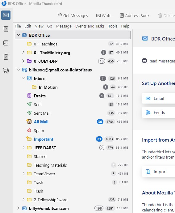 10-24-25 In my setup for 'BDR Office' Thunderbird has stopped displaying all my folders. How do I restore proper display. Noted fact, I have named three of my folders with preceding characters '0 -' on the given file name' so to display together in my list. Odd - these three folders are the only ones that display. See Attached. In my TB setup I have 3 emails set up and it is only the 'BDR Office' (for my email [edited from public] @reagancpa.com) that has ceased to display all my folders. Normally it appears similar to the [edited from public] @gmail.com as seen in the attached. On 10-13-25 I followed several Methods provided by Support.mozilla.org with no success. HELP! if possible phone contact would be best for me. [edited phone# from public community support forum] - Billy