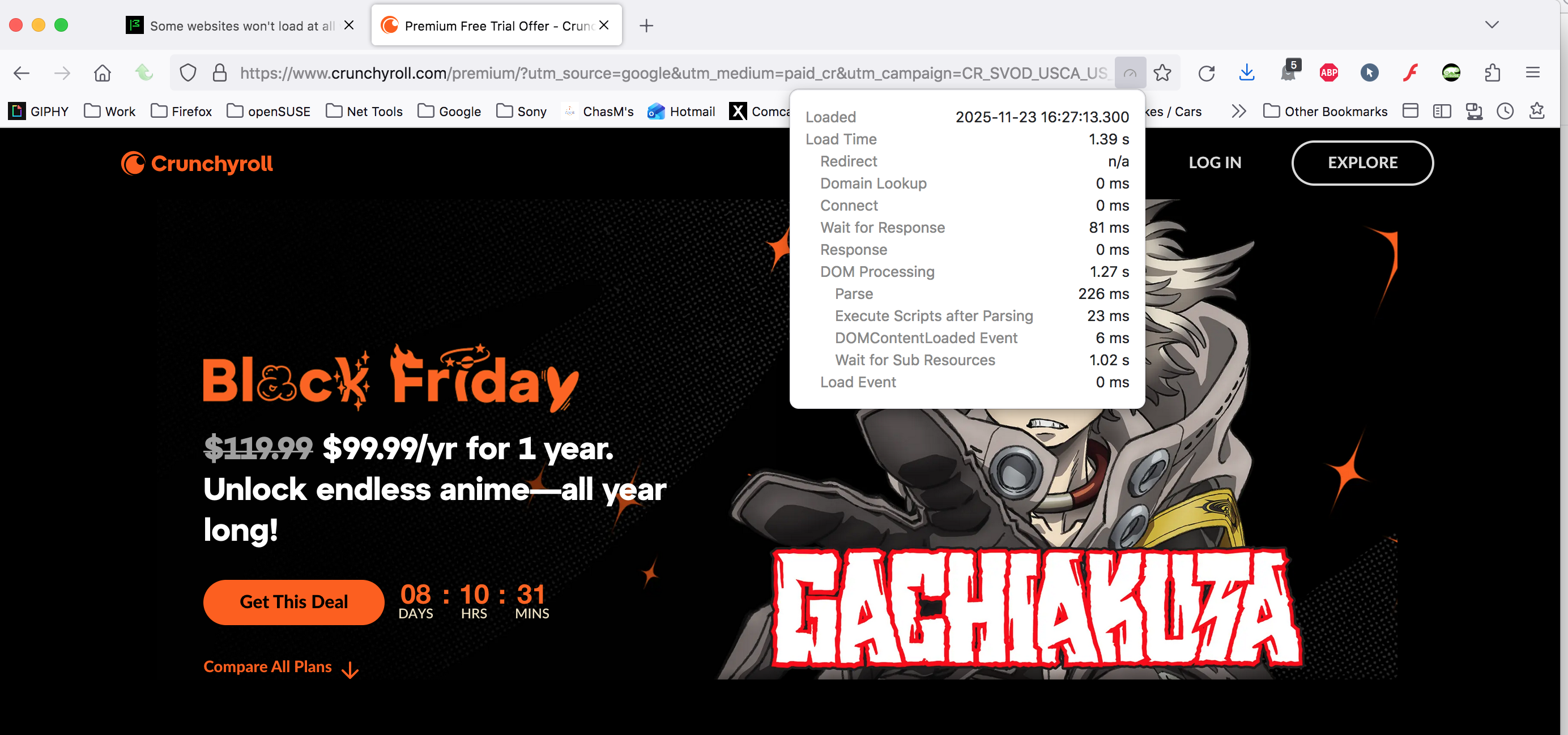 Some websites won't load at all while other are very slow to load but some will load just fine, example Crunchyroll (screenshot attached) won't load at all its just spinning loading icon and a white page but if I try it in a different browser it works just fine, but with Youtube it will load but is choppy and low quality videos and same thing as before I load it in a different browser and no problems. I have tried every possible solution I can find from clearing cookies and cache to refreshing Firefox even scanned for malware and virus nothing has worked please help me figure out what is happening and why it's only with Firefox that I am having this problem and its not hardware can play online just fine and download games from steam perfectly fine.