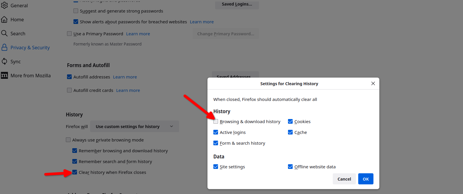 The issue is what do you have Firefox doing when you close the browser. see screenshot You can see from my screenshot that I have Firefox erase cookies, cache, and active logins so that when the browser is reopened I have to login into all the sites. I do want my previous windows and tabs to open which is why that option is not checked.