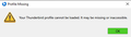 My transfer to the new computer was not taking; followed instructions but no profiles were loading. I thought that perhaps this was due to my initial problematic installation of T-bird decades ago, where I eventually wound up with a choose-user-profile panel that worked fine with its default setting...so I lived with that easily (see image). Thinking that this was causing the inability to load profiles on the new machine, I tested whether I could delete the never-used profiles in that panel. After just one deletion, that resulted in the "Couldn't load XPCOM" error described here: https://support.mozilla.org/en-US/questions/1360766 Following the instructions on that page to do a repair installation (to the letter), starting T-bird now results in the attached "profile missing or inaccessible" message.