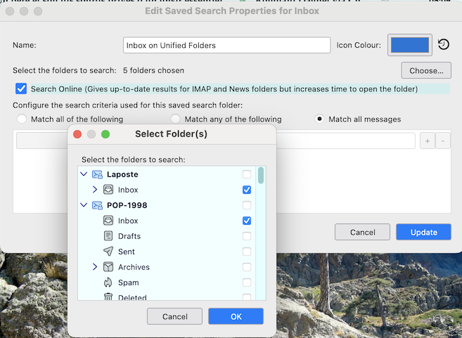 What do you want to choose for the unified Inbox? If you mean the differences in context menu options between a unified Inbox and an individual Inbox folder they are necessary since "Unified Folders" are virtual "saved search" folders. They display messages from different accounts in a mutual "unified" folder, but the messages keep being stored in their original folders. Exemple of a unified Inbox R-click > Properties options > Choose....: here you select or deselect the individual Inbox folders you want to include/exclude in the unified folder display (image)