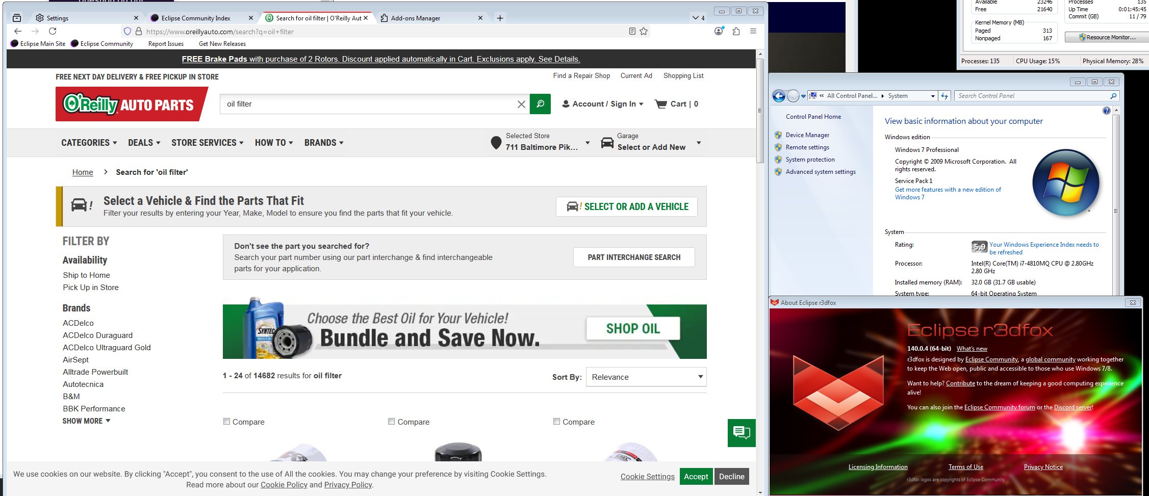 Thanks very much for the suggestion. RedFox does allow me access to O'reilley's search function and is very fast. However, the ability to customize background color and text color on ALL websites has been a distinctive and unique feature of the FireFox browser for over a decade. As far I know it's the ONLY browser that allows this critical appearance customization. Unfortunately, RedFox has adopted Google Chrome's strategy of forbidding this. (Something about, "Your setting's conflict with website colors.") I also notice that RedFox somehow automatically became my default browser after installation, although I don't remember choosing that option. Be that as it may, I'll definitely be using RedFox for the very few sites that deny my Window 7 system's access to some or all functionality. However, because I use a 46", 2010 TV as my monitor, a white background is very painful to the eyes and I'll have to stay with FireFox for the foreseeable future. Thanks again for your help.