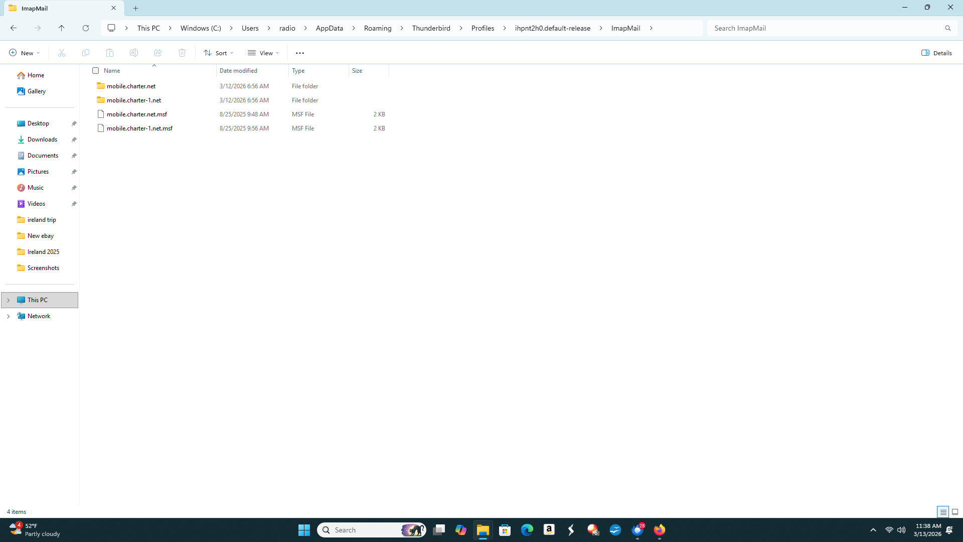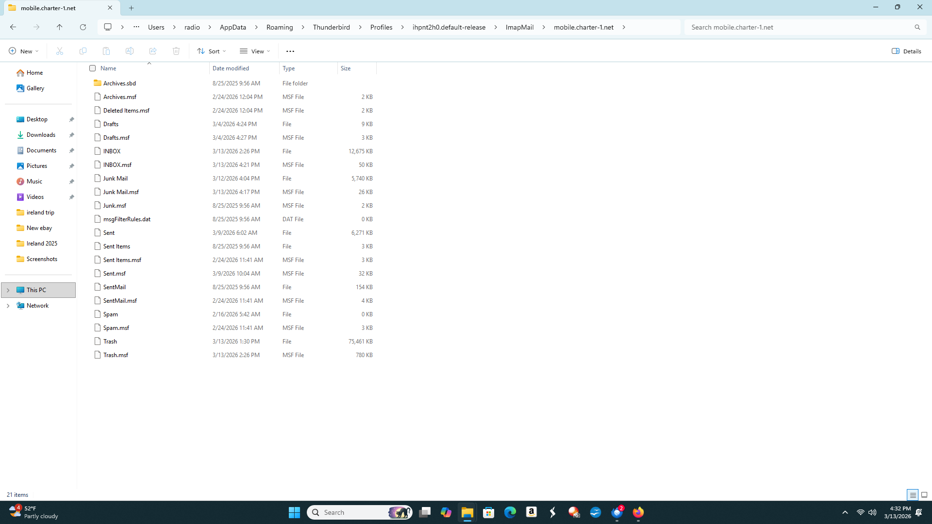 I am sorry to be a little lost, I followed this Help menu > Troubleshooting information > Profile Folder > Show in [...]. I find the Profile Folder, but the only thing in there is "open". When I open it I get a list of things but no mail folder. I use a Microsoft 11 PC.