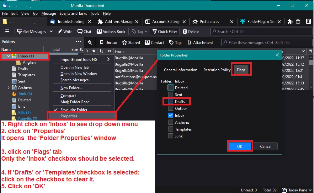 or I was able to translate it better. TO DO THE METHOD AS SHOWN IN THE IMAGES I carefully went thru your top instruction, carefully looking at your latest image & wording. I finally found folderflags and installed the download. I unchecked drafts; Inbox is still checked. WHERE IS THE AUTO UPDATE ADDONS? The update addons automatically is checked I found the FolderFlags addon three dot icon on the right. I clicked on it and selected 'Manage' Under 'Details' tab the 'Allow automatic addons' has 'default' selected