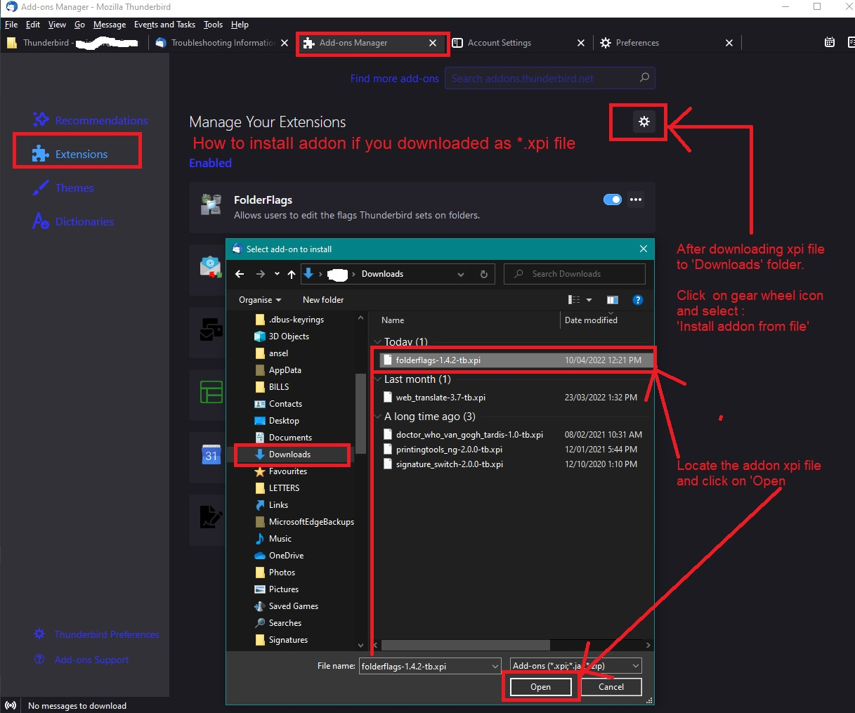 It will open a new window - see image below Locate the 'Downloads' folder to see the 'folderflags-1.5.1-tb.xpi' file you downloaded. Select the file so it shows in the 'Filename' at bottom of window and click on 'Open' A pop up appears asking you to click on 'Add' then another pop up says it was added and you click on 'OK'