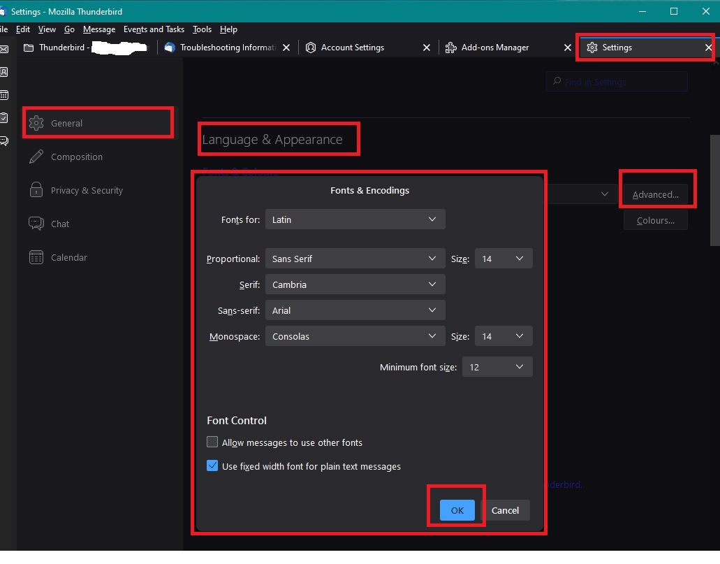 - uncheck - 'Allow messages to use other fonts'
