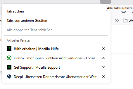I am using tab groups and suddenly they all disappeared. There is no hint or trace of this function, not even in the tab pulldown menue. I checked the internet, I restartet Firefox several times, I restarted my notebook (Windows 11), I checked about:config (tab groups are enabled). I even reinstalled firefox - it seems like tab groups never have existed. What might have happend - and how could I get that feature back? Thank you in advance Wolf