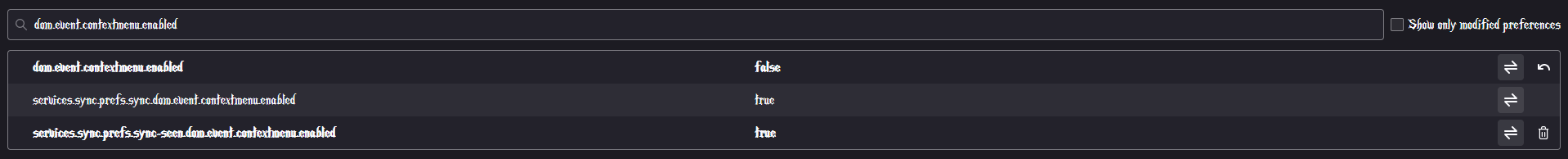 1 - Go to Configuration Editor for Firefox https://support.mozilla.org/en-US/kb/about-config-editor-firefox 2 - Enter a search term dom.event.contextmenu.enabled