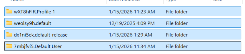 I have attached a picture of my Profiles folder on File Explorer. Firefox is currently using 7mbjfvi5.Default User, and no other options are showing on the About Profiles page. Why am I not seeing the other three files shown here?