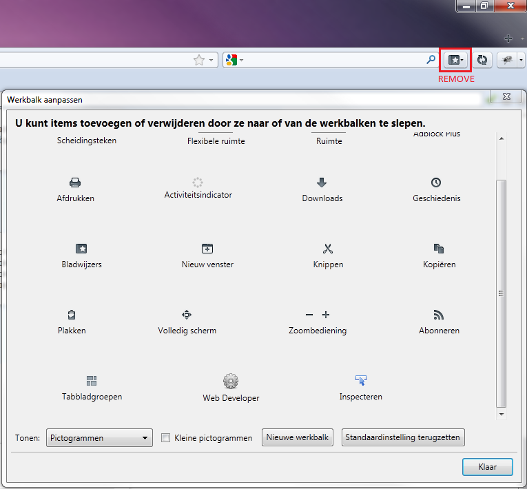 In my bookmarks toolbar there's a "Bookmarks" button I can't seem to remove. I never use this button and would prefer it to be gone so an extra bookmark can take up this place.
