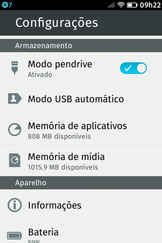 - Configurações; - Role a página para baixo até encontrar o sub-menu 'Armazenamento'; - Veja se a opção 'Modo pendrive' está ativada. - Se não estiver, toque no item 'Modo pendrive' que será.