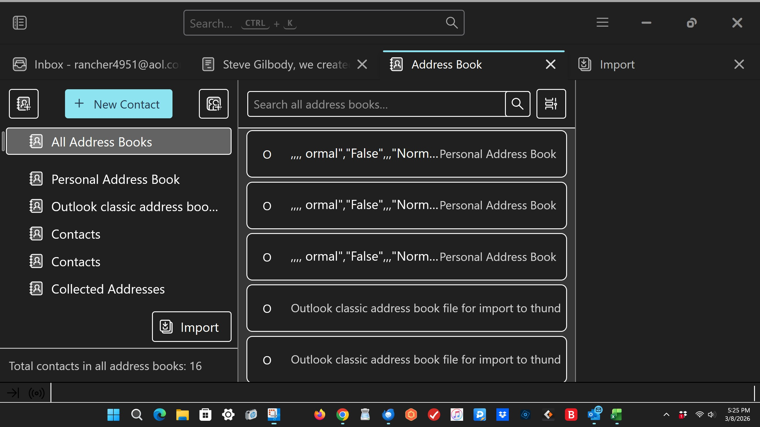 I tried importing my Outlook Classic address book. As you can see from the attachment, I really messed it up!. I am not technical at all, I wasn't sure if I needed to import my contacts or my address book. I think, but am not really sure, that I exported my .pst file, address book to a csv vile.