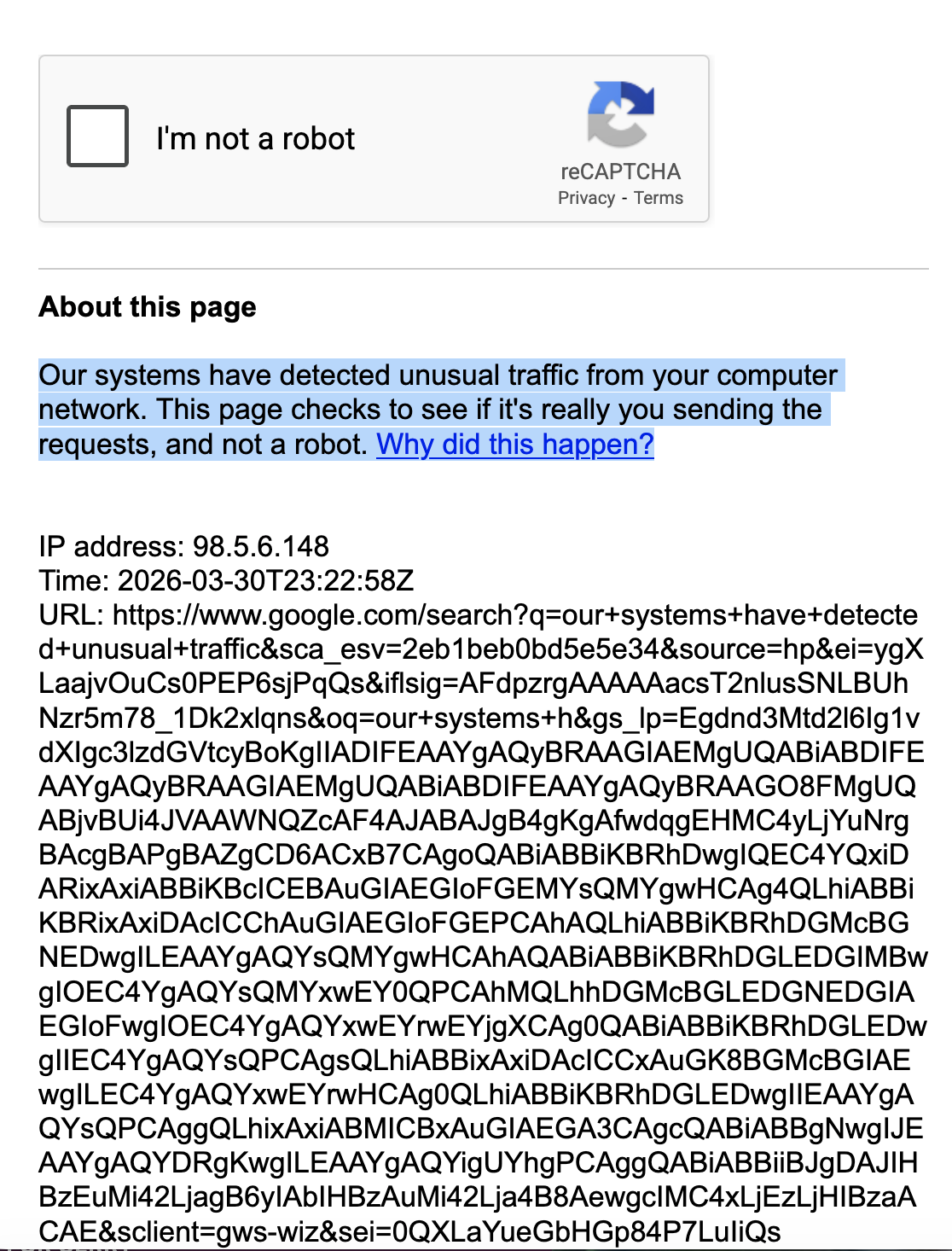 I have been getting issues about the same time with Google (keep getting the reCAPTCHA page see attached file.)