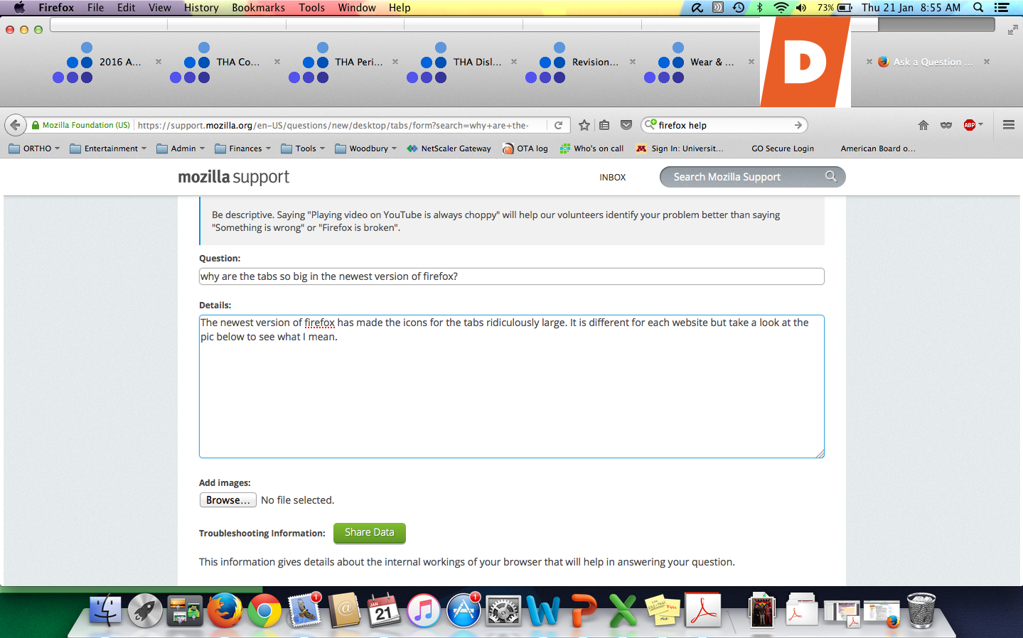 The newest version of firefox has made the icons for the tabs ridiculously large. It is different for each website but take a look at the pic below to see what I mean.