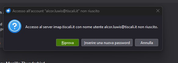 Thunderbirg windows 11 pro ho 4 indirizzi di posta di cui uno: alcor.luwis@tiscali.it. continua a darmi il messaggio di errore ,come da immagine perchè ho questo messaggio imap tiscali