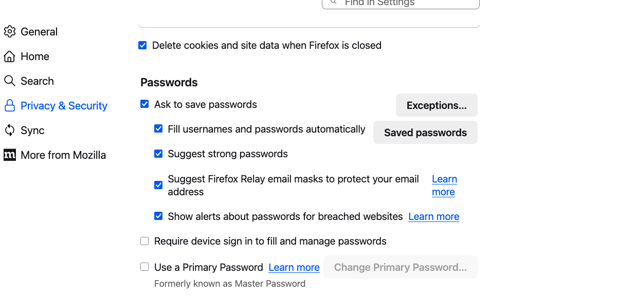 latest version of firefox will not let me save a password on a new website, it has always worked before, see image for settings. website is not included in exceptions