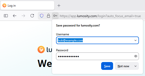 no error code, firefox just doesn't ask to save password. Problem could be with Lumosity website - they have technical issues - they also have some relationship with a service called "Link" which could be part of the problem
