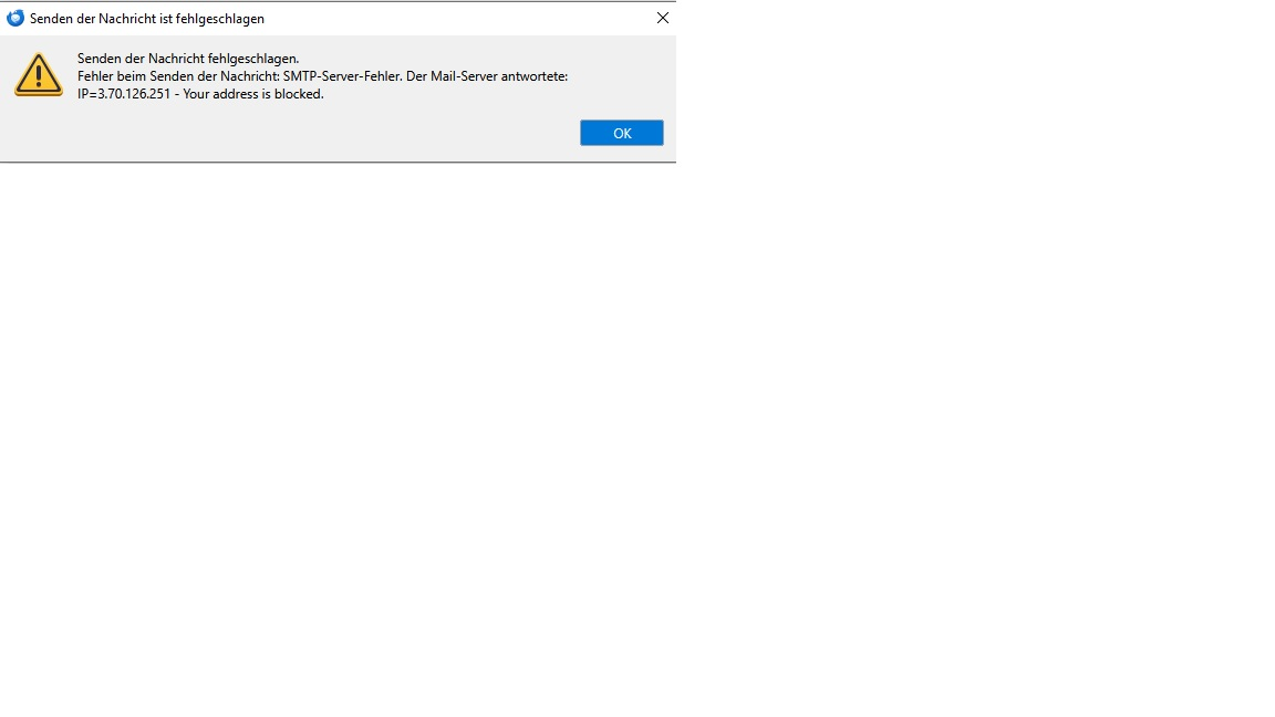 bis zum 5.3.2026 funktoinierte TB einwandfrei, aber seit gestern kann ich keine Mails mehr versenden, folgende Fehlermeldung wird angezeigt siehe Bild Hochgeladen. Gestern wurde die IP 18.195.155.157 angezeigt, heute 3.70.126.251