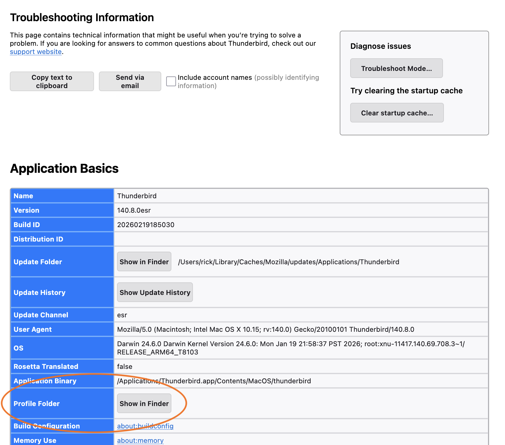 - Help menu > Troubleshooting information > Profile Folder > Show in [...].