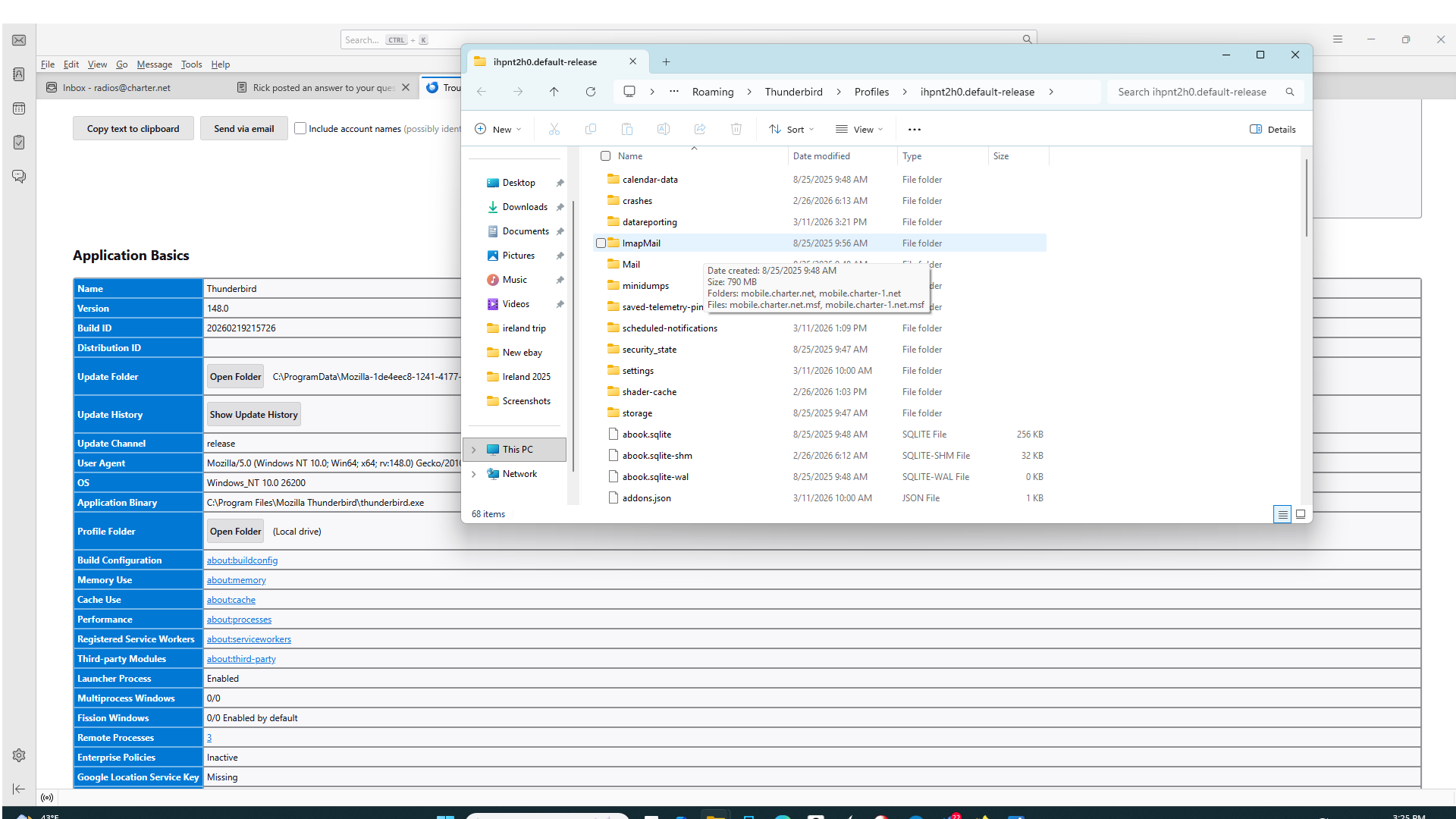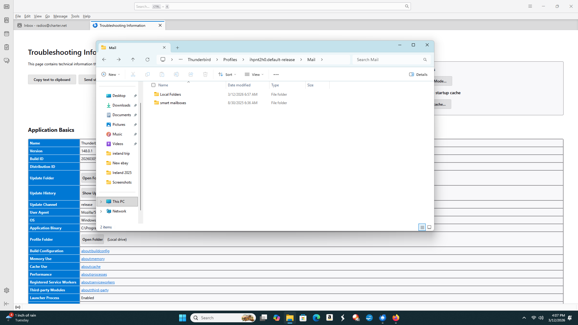 I am sorry to be a little lost, I followed this Help menu > Troubleshooting information > Profile Folder > Show in [...]. I find the Profile Folder, but the only thing in there is "open". When I open it I get a list of things but no mail folder. I use a Microsoft 11 PC.