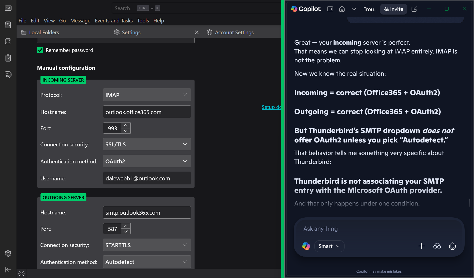 I get this error ALL THE TIME from TB. Sending of the message failed. The message could not be sent because connecting to Outgoing server (SMTP) smtp-mail.outlook.com failed. The server may be unavailable or is refusing SMTP connections. Please verify that your Outgoing server (SMTP) settings are correct and try again. Copilot says that TB is NOT recognizing my personal Outlook email account as a viable SMTP account. Been on line with Copilot for couple of hours without success. Does anyone at Mozilla have anything to offer me?