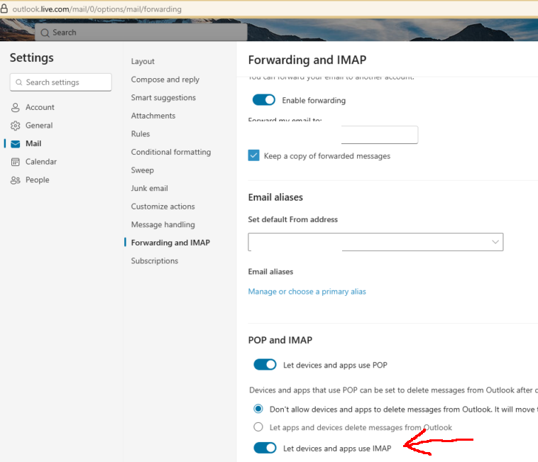 The MS instructions I mentioned above claim that there is a setting at their site that says, "Under POP and IMAP, toggle the slider for Let devices and apps use POP or Let devices and apps use IMAP to ON depending on the account you are enabling." I find no such setting.