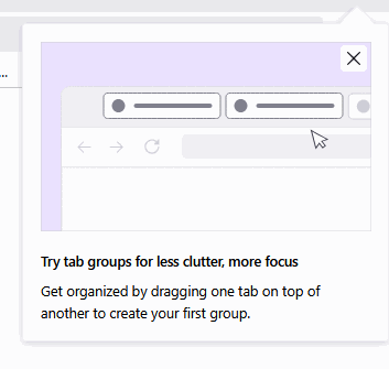 Two weeks ago I started getting popups telling me to use tab groups (pic below). I have no settings governing tab groups, I did not update Firefox, I didn't enable or change anything.