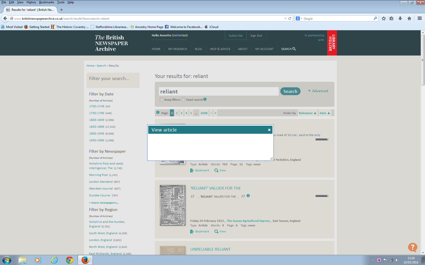 1. Open http://www.britishnewspaperarchive.co.uk 2. enter search term, eg "reliant" although Iget the problem with all searches 3 click "view", the thumbnail or the title. 4 The box should show the page of newspaper but comes up as per screen shot attached. NB it may work correctly the first couple of times but if you log and and come back in it won't.