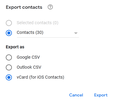 Thank you for reply, however, still same symptoms. Let me go thru the steps and please see if I am missing any: From Google Contacts>Export>Vcard for ios contacts>Export>then a notification box comes up "contacts.csv". What should firefox do with this file? Open with Excel (default) {*note I don't have Excel } other choice here is Save File. I hit cancel and open TB. Then Tools>Import>Address Books>vcard file (.vcf)>window pops up with notice labeled "Import, Select Address book file. I choose the highlighted file labeled CONTACTS which only gives me "no items match your search". The end of this attempt? Help?
