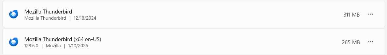 I seem to have (2) Thunderbird Apps Installed (please see the Image attached). I assume the 1/10/2025 File is the most current and one to use? If so, I'm afraid to delete one of them without some kind of confidence that I won't lose any Emails/Settings/Info.