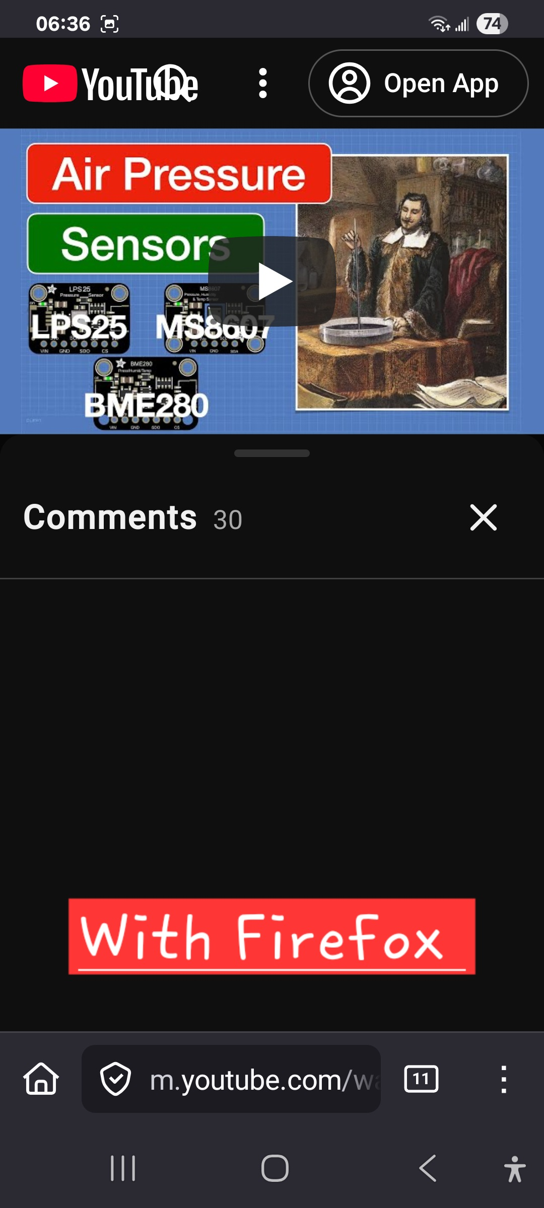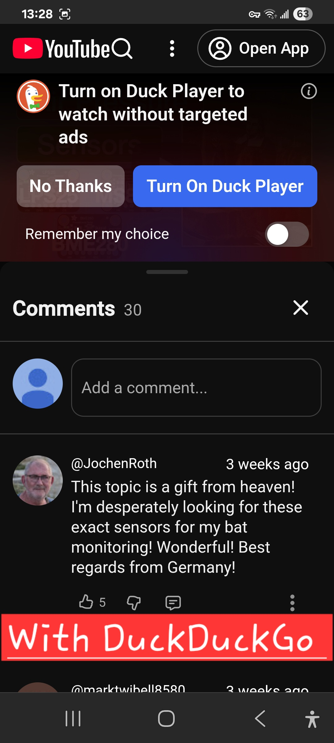 ANDROID 15, FF 144.0.2 When I load any YouTube video from the FF Browser, and click on "Comments", they DO NOT APPEAR! (See attached screenshot). Even though the page states there are a number to view, e.g. 30. This problem started a few months ago, and continues, even after recently updating to 144.0.2. The problem does NOT EXIST with other browsers, e g. DuckDuckGo and Chrome (see screenshots). Nor obviously if I choose to "Open in YouTube ". But if I choose "Cancel", meaning to open the page with the FF Browser, that's when the Comments become INACCESSIBLE. PLEASE HELP!!