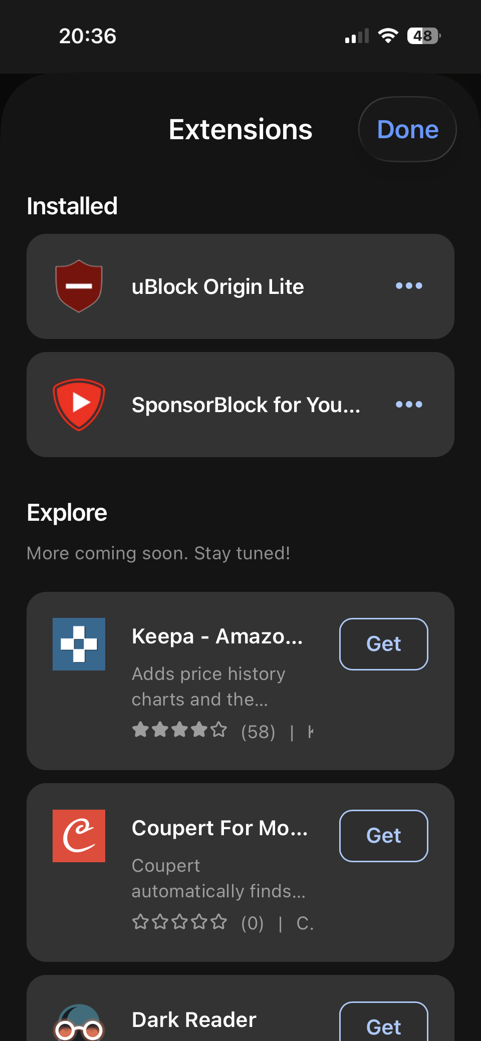 On this forum there is answer that there are no addons becouse Apple doesn’t allow, but I just figured out, that MS Edge has Adblock and sponsor block and ghostery and few other extensions.