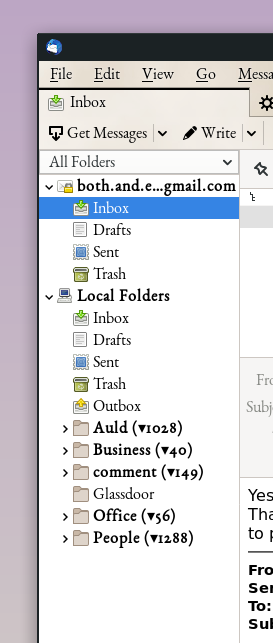 But, under 'Local Folders', although I have the various subdirectories where I store my incoming mail by filters and by hand, I also have what I suspect are useless "Inbox" "Drafts" "Sent" "Trash" and "Outbox" folders.