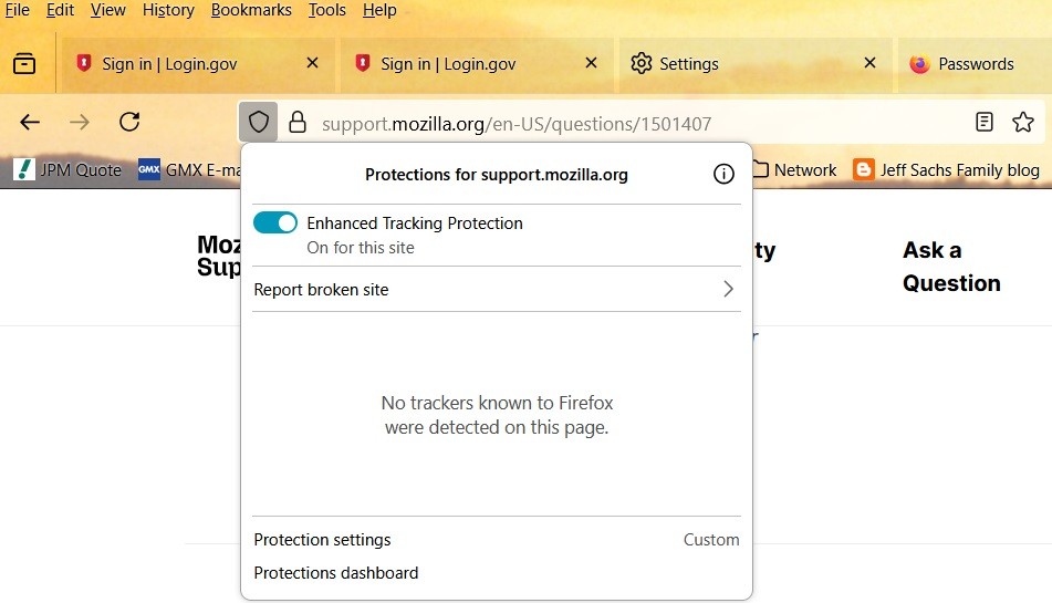 Show the issue and provide links. Login.gov works for me. see screenshot Did you try with Firefox in Troubleshoot Mode? https://support.mozilla.org/en-US/kb/diagnose-firefox-issues-using-troubleshoot-mode#search