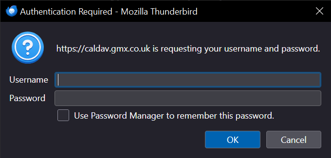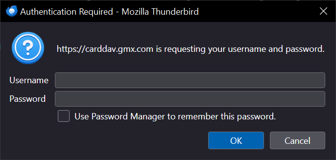 When I open Thunderbird, I now get a message window asking for a User Name and password for both Caldav and Carddav.