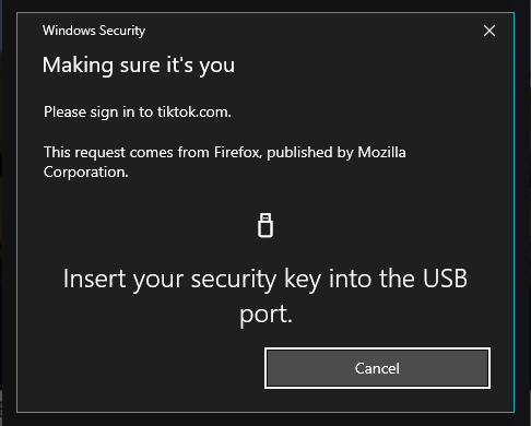Logged out on TikTok, when trying to log in, windows security says Firefox wants me to insert security key into USB...