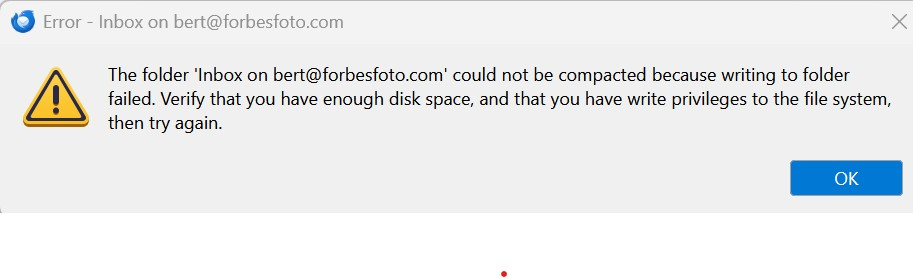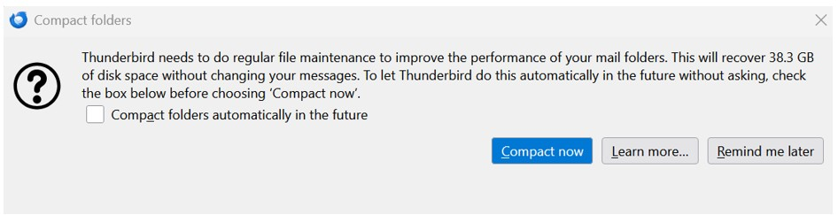 Recently I've noticed that Thunderbird asks to compact folders very frequently and if I say 'later' the size of the file needing compacting grows substantially each time (typ. 3 to 5 GB increase). See attached screenshot When I finally tell it to compact folders, the message pane goes blank but usually (but not always) returns. When it does come back there is an error window (See attached screenshot )