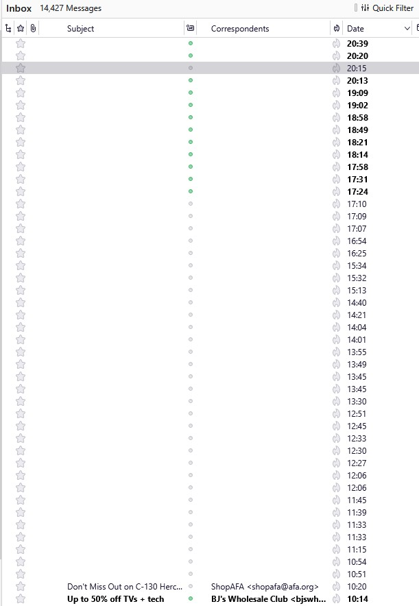 The columns for Subject and Correspondents are there, but they are blank for all my messages after 10:20 AM. The message body is like I said—it looks like I selected View|Message Source. I have both of my email accounts for Optimum and Gmail on Thunderbird. Optimum is POP and Gmail is IMAP. The Gmail message that I received a few minutes ago looks normal. The messages accessed on my Optimum webmail account look fine as well so it looks to me to be a Thunderbird issue.