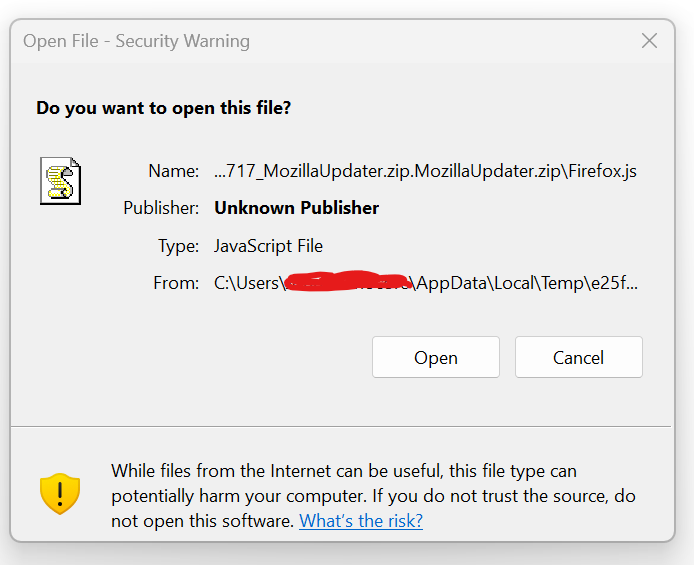 Not doing forum support much now days however this is the first time I have seen a fake Firefox update .js mentioned in some seven years as I had a ongoing thread about the fake update patches back then in /forums/contributors/712056. The scammers initially started with say update-patch.exe but they were getting flagged/blocked more easily so they switched to firefox-patch.js