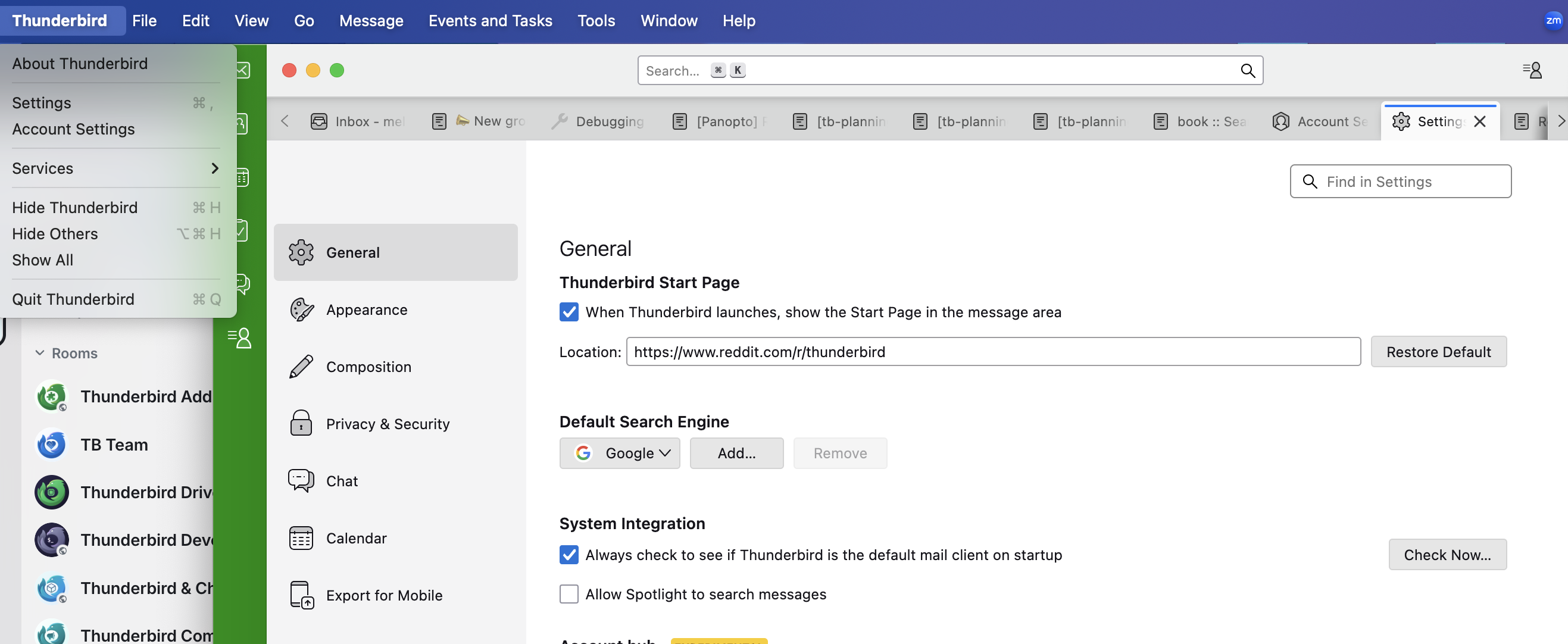 Steps: Go to Settings (or Preferences on macOS). Scroll to the General section. Under Start Page, uncheck “Show Start Page in the message area when Thunderbird launches”. -OR- Change the url to something else. In my screenshot, I've made it the Thunderbird Reddit page.