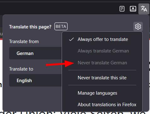 The "never translate x" button is greyed out. Why? Can´t add the language to the "never translate" languages in the settings either. Thank you for your time and effort kind strangers! :)
