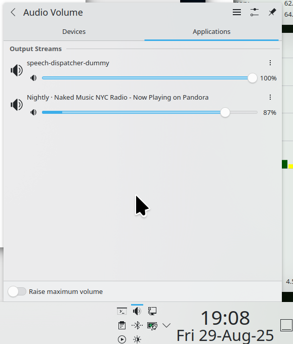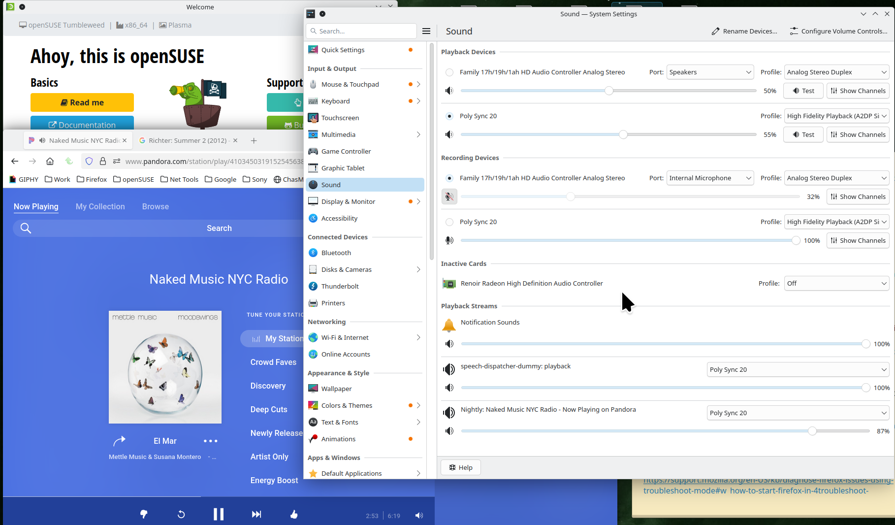 Your OS handles the sound output. Works for me. see screenshot Show us something similar to my screenshots. I'm currently listening to Pandora via a usb speaker Poly 20.
