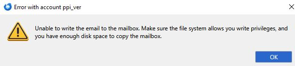Error message: Unable to write the email to the mailbox. Make sure the file system allows you write privileges, and you have enough disk space to copy the mailbox.