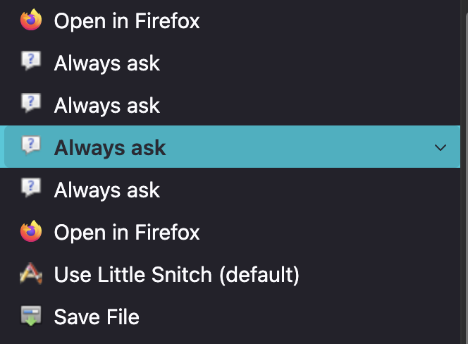 in Settings under "Applications" i had the "Do Nothing" options chosen for several file types, to prevent automatically getting kick to a different app every time i opened certain webpages (ie Telegram links). the "Always Ask" option is available but that also disrupts workflow with the popup box and no quick keyboard shortcut to dismiss it. i am about to downgrade i am so frustrated about this. i have several hundred pages to go through, and it should be as easy asopening the pasge and selecting text, but now each time the page opens, i'm forced to either switch apps or manually dismiss a popup.