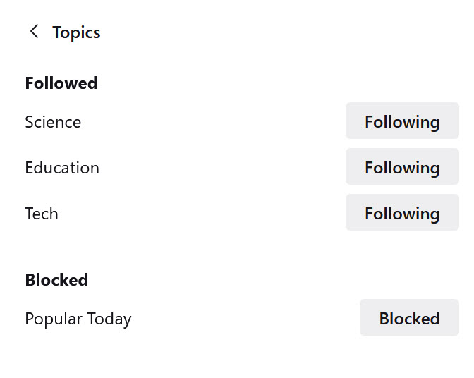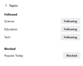 Your new home page "recommended stories" are now categorized under topics (Popular, Science, Education, etc.) I blocked the category of "politics" and it no longer shows that category in the customization menu as an option. Furthermore, there was a Travel category that I wanted to see regularly but it has completely disappeared (as of today)! (I was just reading from it last night!) So frustrating.