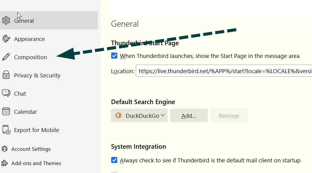 I only see general, home, search, privacy, sync, and firefox labs under my settings options. There isn't a composition option in any of those headings either