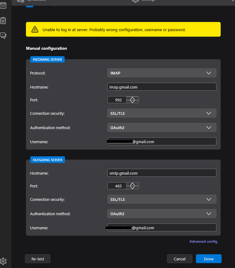Hi all, I've had 2 gmail accounts set up on my windows PC and I also have them now on my Thunderbird android, actually 2 mobiles and on my laptop. Both worked fine. I haven't used my PC since May, and now I saw that since then Thunderbird won't download my mails. (But only on that one gmail account - not on the other one) Now, I've changed my password with google, adapted it and on the mobile it works perfect - but not on my PC. So - I've deleted the one, set it up again, (it's the same as the other gmail settings) but it doesn't work. (screenshot) I also deleted google access to thunderbird (thought maybe there is an old password in or so) and in the mobile it set up a new access without problems (Thunderbird Freeyour Inbox) ... ... but still nothing is happening on the PC set up. anything else I can try? Thanks for any advise or help, Caro